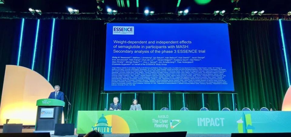 编者按:司美格鲁肽是一种胰高血糖素样肽-1(GLP-1)受体激动剂,最初被开发用于2型糖尿病(T2D)的治疗,后来发现其在减重和对糖尿病/肥胖患者多器官保护方面也具有显著疗效。近年来,在代谢相关脂肪性肝炎(MASH)领域,已有研究表明司美格鲁肽具有显著改善肝纤维化和脂肪性肝炎的作用。在其用于MASH人群的III期ESSENCE 试验的72 周中期分析中,每周一次皮下注射2.4 mg司美格鲁肽达到了MASH缓解且纤维化无恶化,以及纤维化改善≥1级且MASH无恶化的“双终点”[1]。在2025美国肝病研究学会(AASLD)年会上,英国学者Philip Newsome教授进一步口头报告了ESSENCE试验的二次分析[2],其结果提示司美格鲁肽治疗MASH患者的肝脏获益独立于体重减轻,在不同减重幅度的患者中具有趋势一致的获益。
