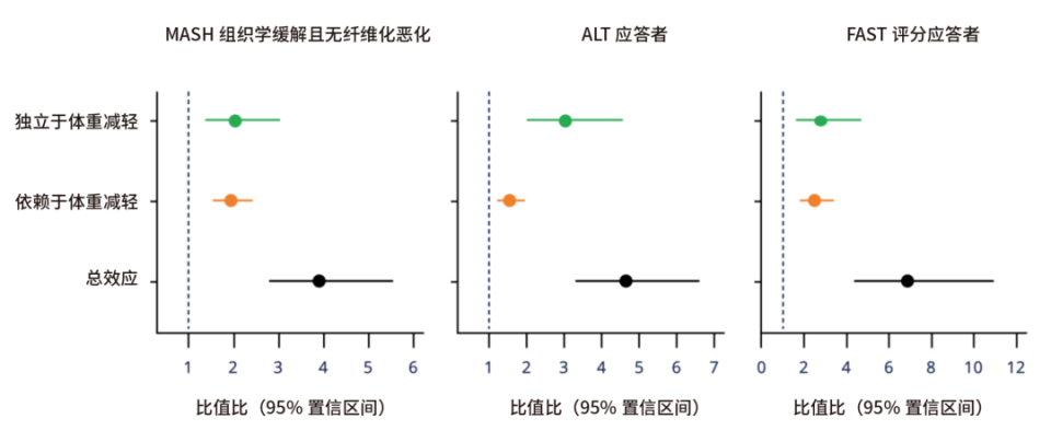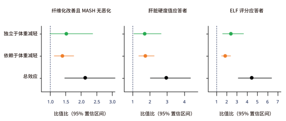 对于MASH相关终点,司美格鲁肽的总效应(OR [95% CI])在组织学MASH缓解且纤维化无恶化和ALT降低方面分别为3.9(2.8–5.5)和4.7(3.3–6.6)。其中,体重非依赖性效应的OR值分别为2.0(1.4–3.0)和3.0(2.0–4.6),体重依赖性效应的OR值分别为1.9(1.6–2.4)和1.5(1.2–2.0),见图3。这表明司美格鲁肽在缓解MASH方面,大部分效应独立于体重减轻。