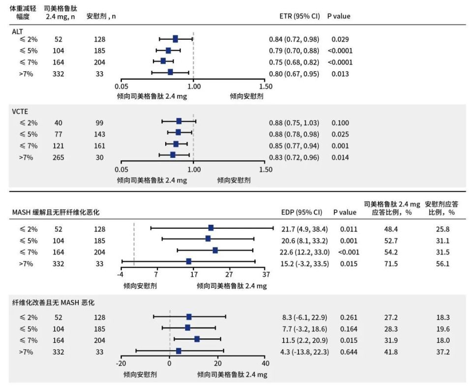 图5. 基于体重减轻幅度的MASH及纤维化相关终点分层分析