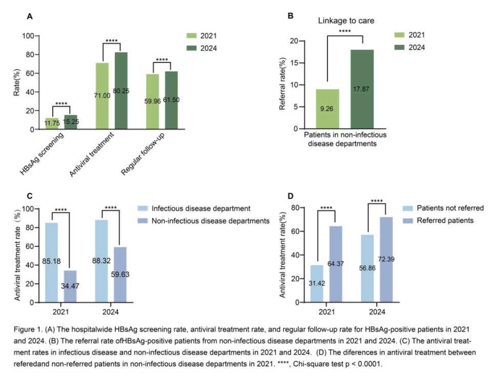 “热浪计划”于2022年启动,具体措施包括:对非感染科医生开展HBV相关知识教育、通过检验科报告提醒HBsAg阳性患者转诊至感染科、提供多种形式的患者教育、加强患者随访,以及利用大数据监控医院内HBV感染数据等。项目实施三年后,我们收集并比较了2021年与2024年间中山三院的HBsAg筛查率、HBsAg阳性患者的抗病毒治疗率、规律随访率以及非感染科的转诊率等关键指标。
