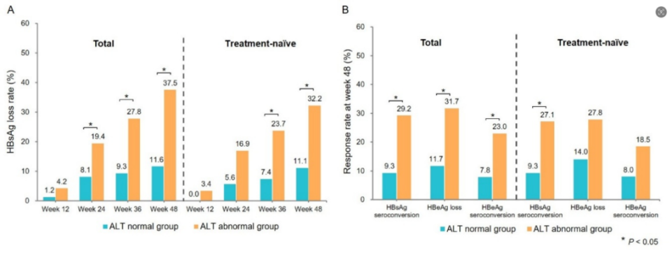 在总人群中,第 48 周时 ALT 异常组和正常组的 HBsAg 清除率分别为 37.5% 和 11.6%(P=0),HBeAg 清除率分别为 31.7% 和 11.7%(P=0.004)。ALT 异常组和正常组在第 48 周时实现 HBsAg 血清学转换和 HBeAg 血清学转换的患者比例分别为 29.2% 和 23.0% 以及 9.3% 和 7.8%,前者显著高于后者(P=0.001和0.012)。