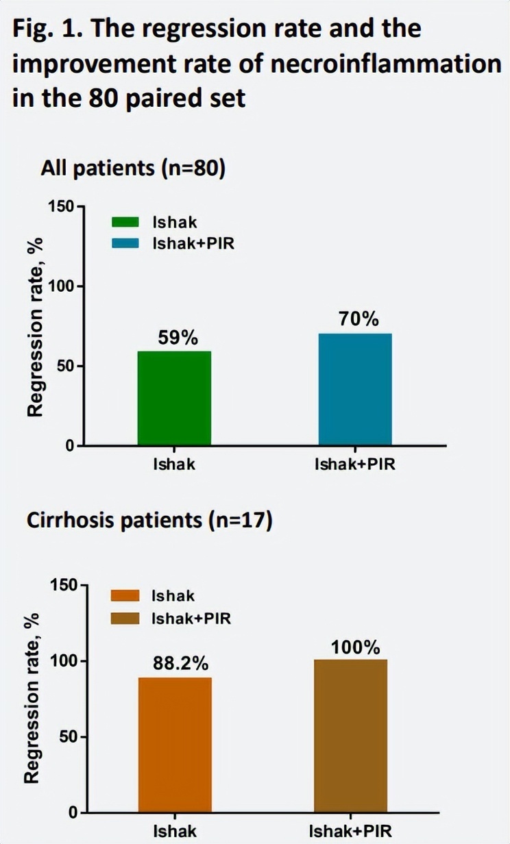 这项研究从中国10家三级医院招募了100例初治CHB受试者,这些患者经活检证实存在肝纤维化或肝硬化。在TAF治疗96周后,80%的受试者接受了第二次肝活检。肝纤维化逆转定义为根据Ishak评分下降≥1级,或根据P-I-R标准评估为主要逆转。在每24周随访时,检测病毒学应答(VR:HBV DNA <20 IU/mL)、生化学应答(ALT ≤40 IU/L)、肝硬度检测(LSM),同时天门冬氨酸氨基转移酶与血小板比值指数(APRI)和肝纤维化4指数(FIB-4)也被统计。