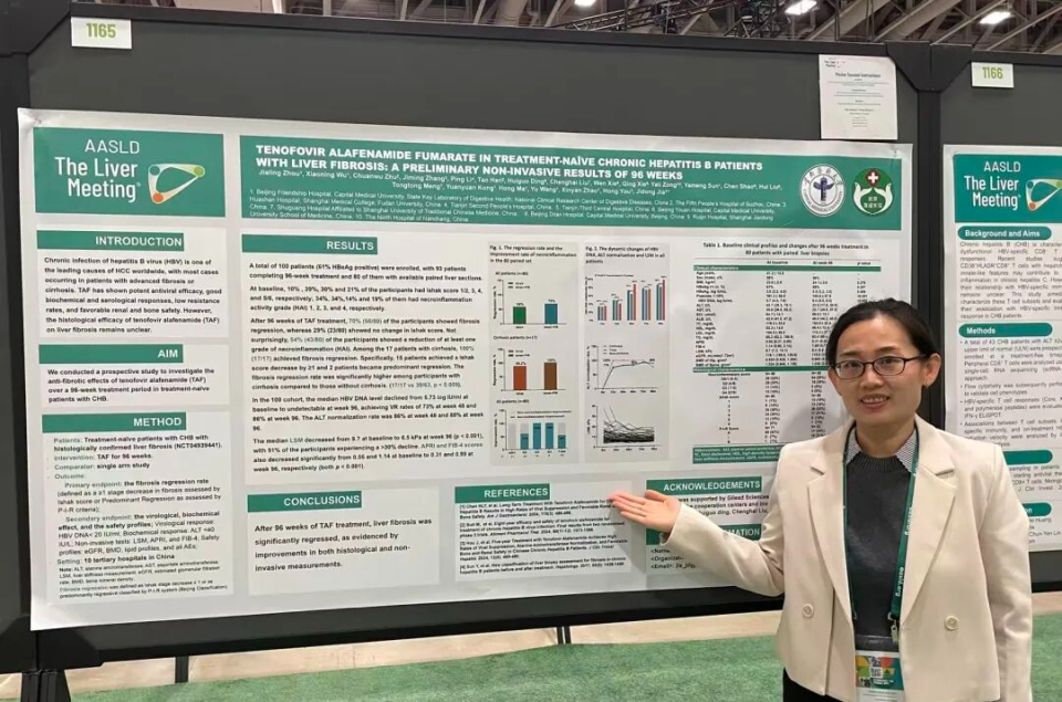 编者按:乙型肝炎病毒(HBV)慢性感染仍是全球肝细胞癌(HCC)的主要病因之一,其中多数病例发生在进展期纤维化或肝硬化的患者中。富马酸丙酚替诺福韦(TAF)具有显著的抗病毒疗效、良好的生化指标改善和血清学应答,耐药率低,且对肾脏和骨骼具有良好的安全性。然而,TAF对肝纤维化的组织学疗效仍不明确。在美国华盛顿召开的2025年美国肝病研究学会(AASLD)年会上,首都医科大学附属北京友谊医院贾继东教授、周家玲副研究员团队联合全国9家中心开展了一项前瞻性、多中心研究,旨在评估TAF在96周治疗期间对初治慢性乙型肝炎(CHB)患者肝纤维化逆转的疗效。该项研究成果入选壁报交流,引发了广泛关注。