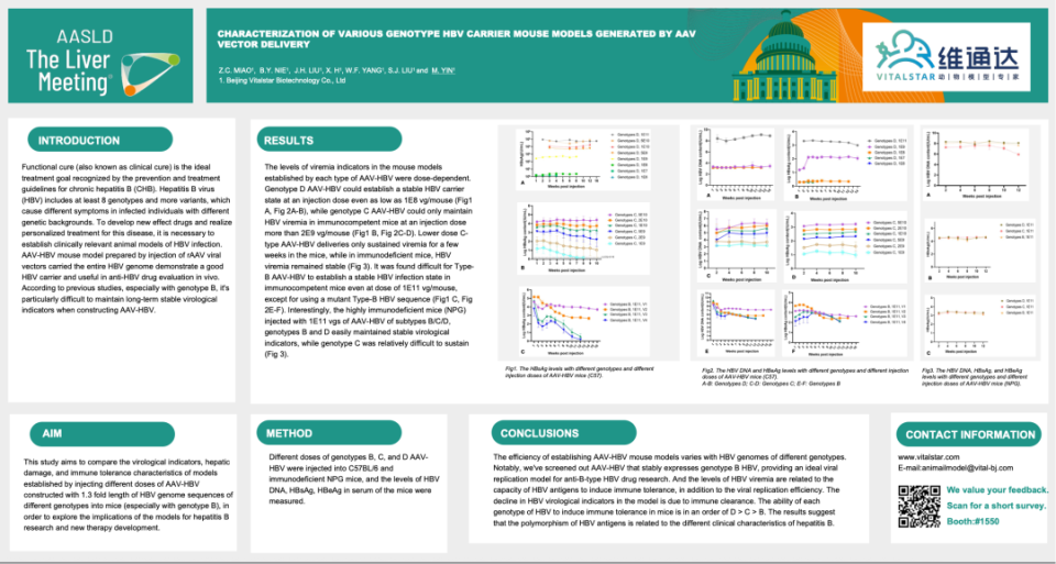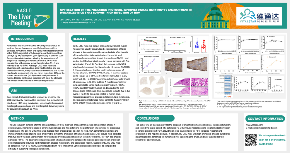 编者按:在慢性乙肝病毒(HBV)感染的机制研究与抗病毒药物开发中,动物模型的临床相关性始终是制约转化医学的关键瓶颈。2025年11月7日-11日,第76届美国肝病研究学会(AASLD)年会在美国 • 华盛顿会议中心召开。在本届大会上,维通达尹明博士、苗振川博士研发团队通过两项创新研究,分别从人源化肝脏小鼠模型优化与多基因型HBV载体模型构建角度突破技术壁垒,其成果入选国际肝病研究顶会AASLD 2025壁报展示,为肝病研究提供了更精准的工具支撑。