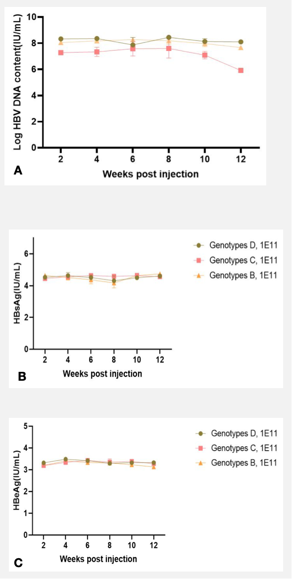 每种AAV-HBV载体所建立的小鼠模型,其病毒血症指标水平均呈剂量依赖性。D基因型AAV-HBV即使注射剂量低至1×10⁸vg/只,也能建立稳定的HBV携带状态(图3A、图4A-B);而C基因型AAV-HBV仅在注射剂量超过2×10⁹vg/只时,才能在免疫正常小鼠中维持HBV病毒血症(图3B、图4C-D)。低剂量C基因型AAV-HBV载体在小鼠中仅能维持数周病毒血症,而在免疫缺陷小鼠中,HBV病毒血症可保持稳定(图5)。研究发现,即使注射剂量高达1×10¹¹ vg/只,B基因型AAV-HBV在免疫正常小鼠中也难以建立稳定的HBV感染状态,除非使用B基因型HBV突变体序列(图3C、图4E-F)。有趣的是,向高度免疫缺陷NPG小鼠注射1×10¹¹ vg的B/C/D亚型AAV-HBV载体后,B、D基因型易维持稳定的病毒学指标,而C基因型相对难以维持(图5)。