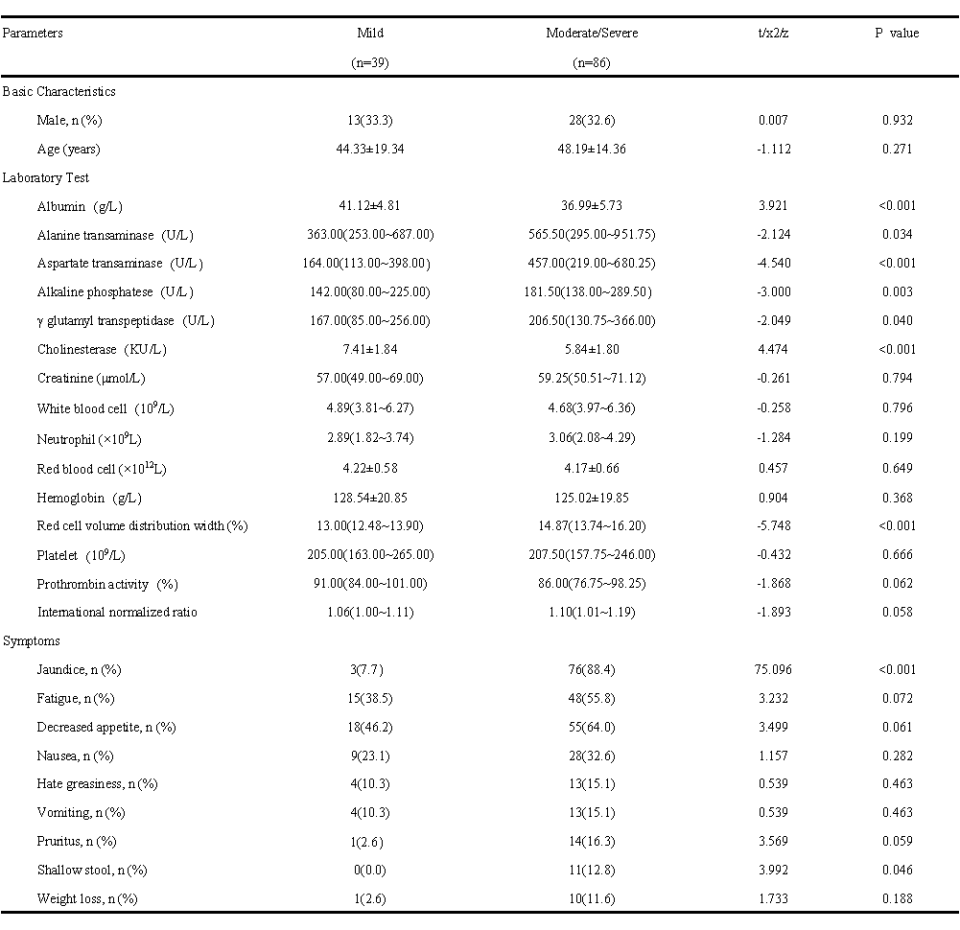 采用回顾性研究分析方法纳入2021年6月至2024年10月于河北医科大学第三医院确诊的125例DILI患者作为训练集。根据2023年DILI诊疗指南严重程度评估标准,其中39例为轻度(1级),86例为中重度(≥2级)。 此外,收集了2024年11月至2025年5月期间同院确诊的另外45例DILI患者临床数据作为验证集。采用SPSS 27.0.1进行数据分析并绘制ROC曲线,校准曲线、DCA曲线及列线图通过CNSknowall平台(https://cnsknowall.com)绘制。