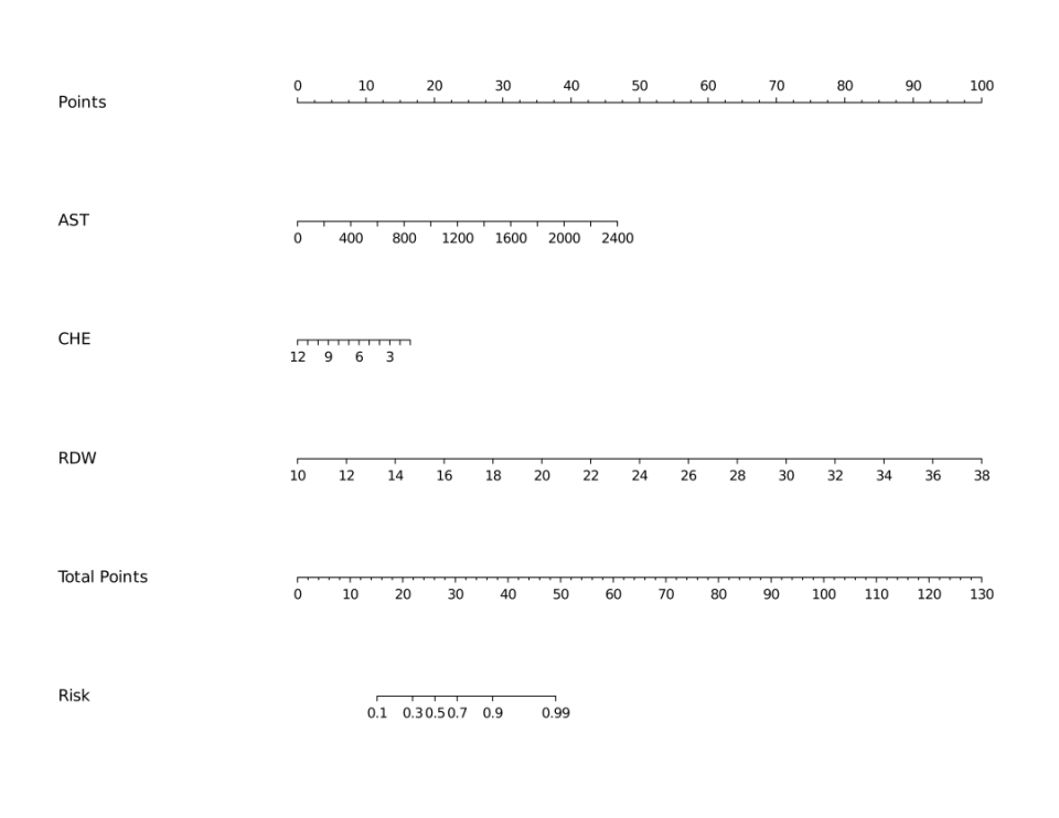 首先指标组合具有创新性与临床实用性。研究将传统肝损伤标志物(AST)、肝脏合成功能标志物(CHE)与系统性炎症/营养状态标志物(RDW)相结合,这表明DILI的严重程度并非仅由肝细胞坏死程度决定,而是与肝脏的储备功能及全身性病理生理反应密切相关,为理解DILI的发病机制提供了新的视角。ACR评分所依托的指标均为临床常规检测项目,成本低廉、获取便捷,该模型有潜力成为一种高效评估工具,能够辅助临床医生快速、客观地识别出有高风险进展为重症的DILI患者。