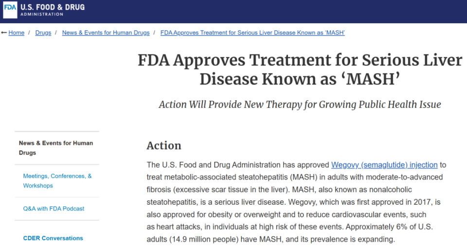图1. FDA批准司美格鲁肽2.4 mg用于治疗MASH患者的新闻
