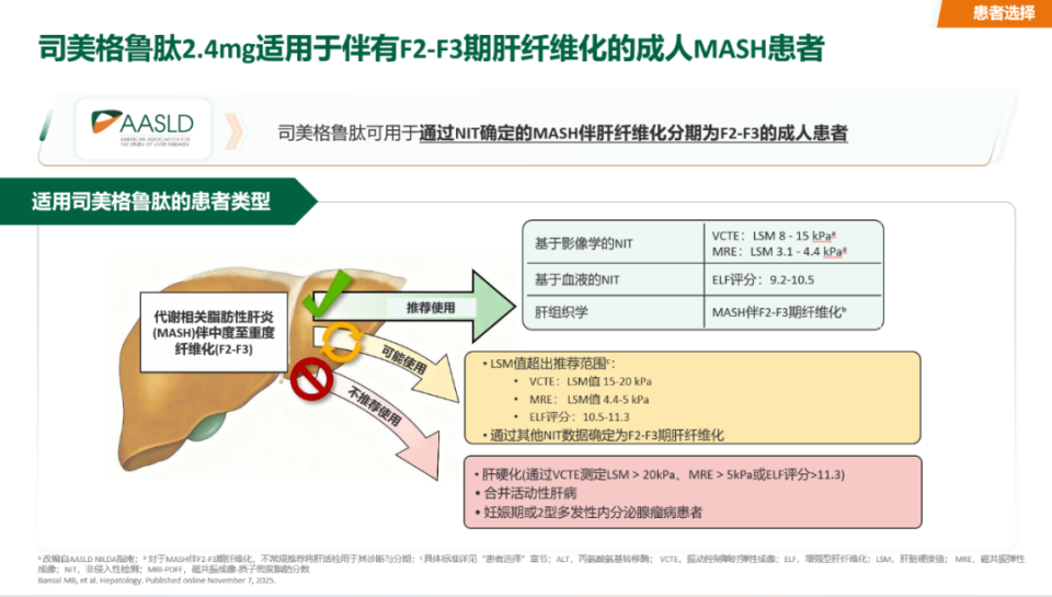 AASLD指南的制定,正是为了回应实际的临床需求。具体而言,该指南首先界定了适用司美格鲁肽治疗的MASH患者人群。在我国临床实践中,目前仍应基于该药物已获批的2型糖尿病和超重/肥胖适应症进行用药考量。在肝病方面,关键环节在于准确识别处于F2-F3期的患者。实际操作中需完成两方面的排除:一是F1期患者,此类患者有望通过生活方式干预实现病情缓解;二是肝硬化患者,因司美格鲁肽在该人群中的研究证据尚不充分,故暂不推荐使用。