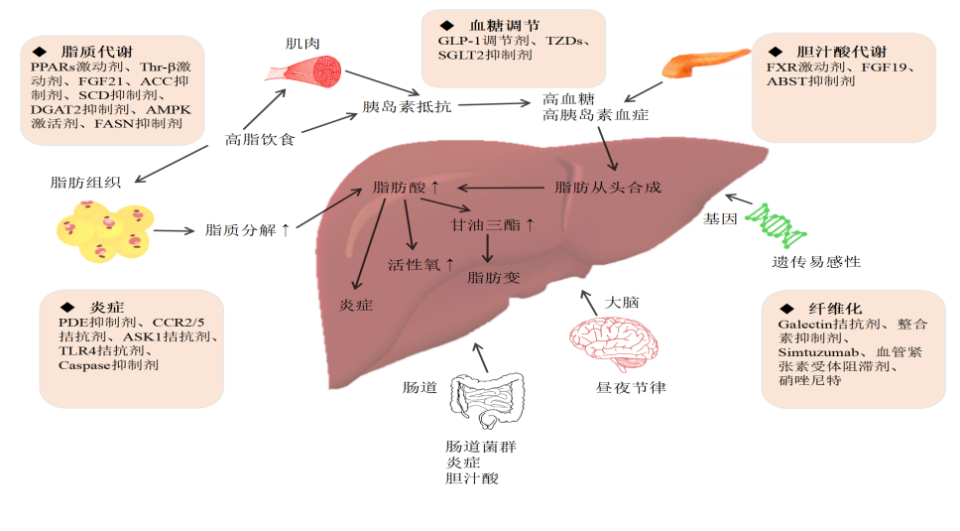 胰岛素抵抗(IR)、氧化应激、炎症、肥胖、代谢综合征、2型糖尿病、脂肪组织分泌的激素、肠道微生物和表观遗传等在内的所有因素均被认为在MAFLD的发生和发展中起着关键作用;在目前MAFLD的药物研发中,研究人员通常针对脂质代谢、炎症或纤维化等途径选择相应的治疗靶点[1](图3)。
