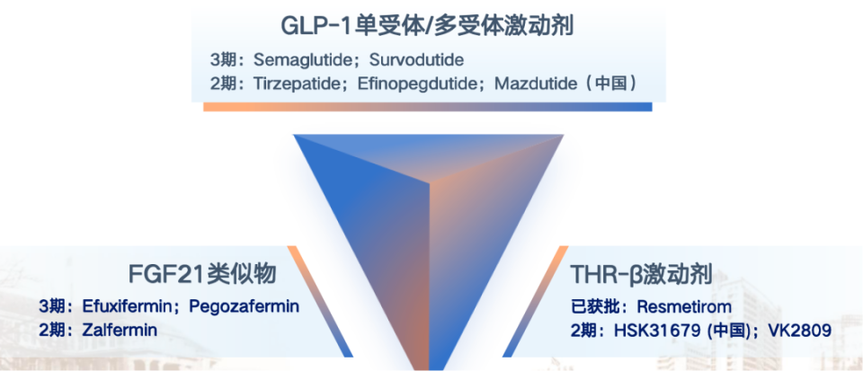 然而,肝纤维化的改善甚至逆转仍是未被满足的治疗需求。基于Ⅲ期数据,GLP-1RA和THR-β激动剂类药物在改善肝纤维化方面的疗效仍有局限,FGF21类药物在纤维化改善方面展现出有潜力的Ⅱb期结果,经安慰剂校正后,纤维化改善且MASH无恶化的患者比例约为20%,但还需在更大样本的Ⅲ期试验中进一步验证[5,15]。FGF21的联合治疗可能是未来的发展方向。