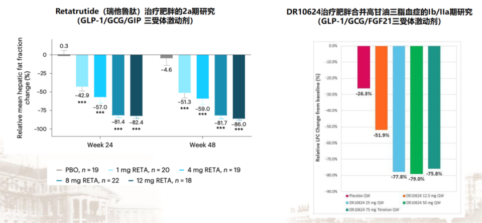 三受体激动剂也展现出早期潜力,如DR10624(GLP-1/GCG/FGF21三受体激动剂)治疗肥胖合并高甘油三酯血症的Ⅰb/Ⅱa期研究,以及Retatrutide(瑞他鲁肽,GLP-1/GCG/GIP三受体激动剂)治疗肥胖的Ⅱa期研究,这些药物在强力降低肝脏脂肪含量方面表现出明显作用[8-9](图8)。