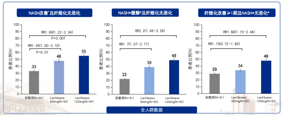 图10. Lanifibranor治疗后MASH缓解、肝纤维化改善比例的Ⅱ期研究全人群数据分析