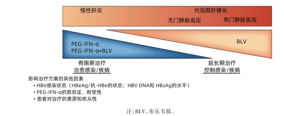 推荐意见:所有CHD和代偿期肝病患者均应考虑BLV治疗(LoE 3,A,80%共识)。最佳剂量和疗程尚未确定(LoE 5,85%共识);目前建议长期使用BLV 2 mg,每日一次(LoE 5,B,85%共识)。对PEG-IFN-α耐受或无禁忌者,可考虑联合治疗(LoE 5,B,88%共识)。