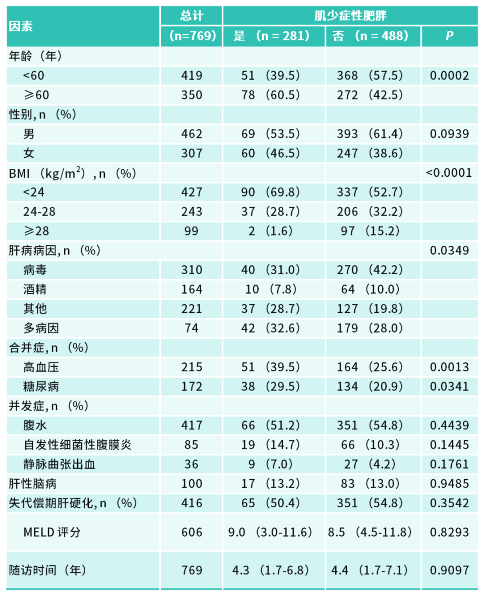 表1. 肌少症性肥胖肝硬化患者的基线特征(n = 769)