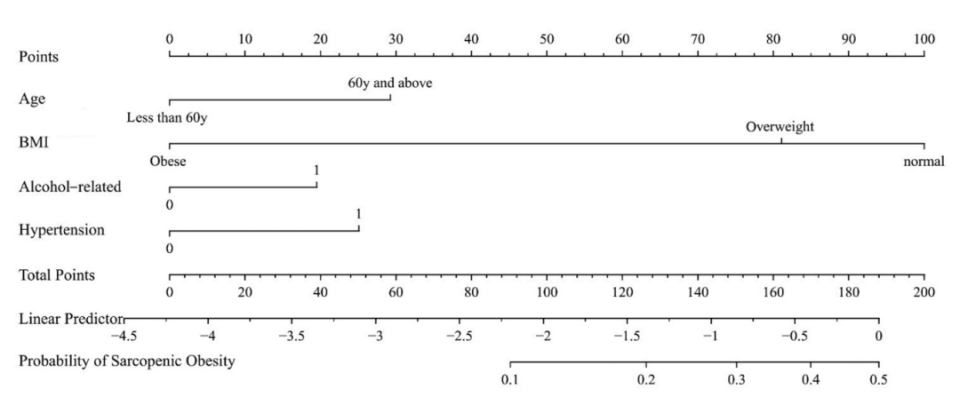 图1. 按照肌少症性肥胖的预测因素绘制的ABAH列线图