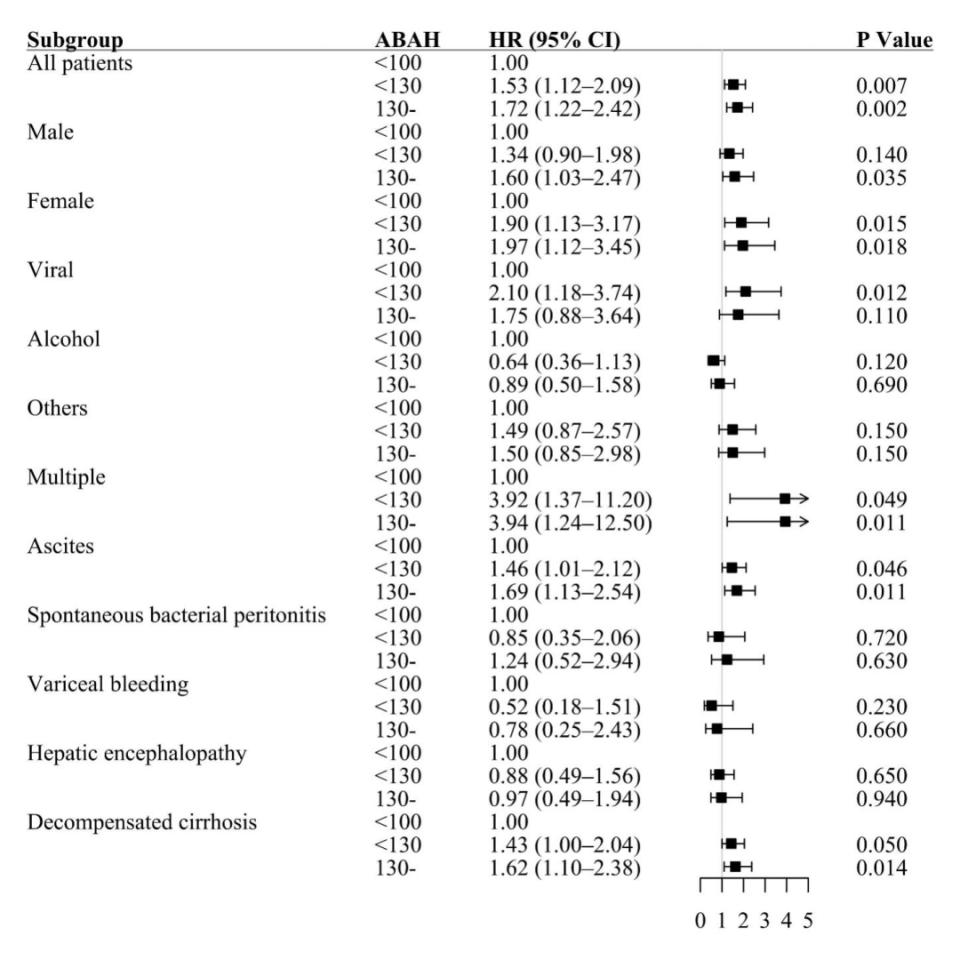 图2. 肝硬化患者亚组中各ABAH分层的死亡风险比