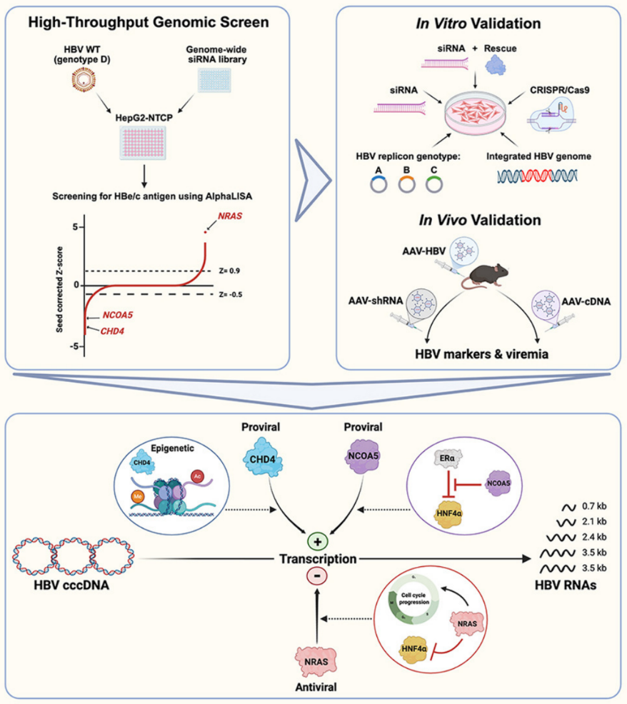 编者按:乙型肝炎病毒(HBV)需借助人体肝细胞机制实现感染与增殖。近日,一项发表于Journal of Hepatology的研究通过大规模基因筛选,发现了可促进或抑制HBV的人类蛋白,鉴定出两种助力HBV复制的关键蛋白(NCOA5和CHD4)以及一种抑制HBV的蛋白(NRAS),并在人肝细胞及小鼠模型中验证了上述发现。明确这些蛋白调控HBV的作用机制(包括调控病毒转录、修饰病毒DNA或影响细胞增殖),可为研发针对这一严重肝脏感染的更优治疗方案提供潜在新靶点。