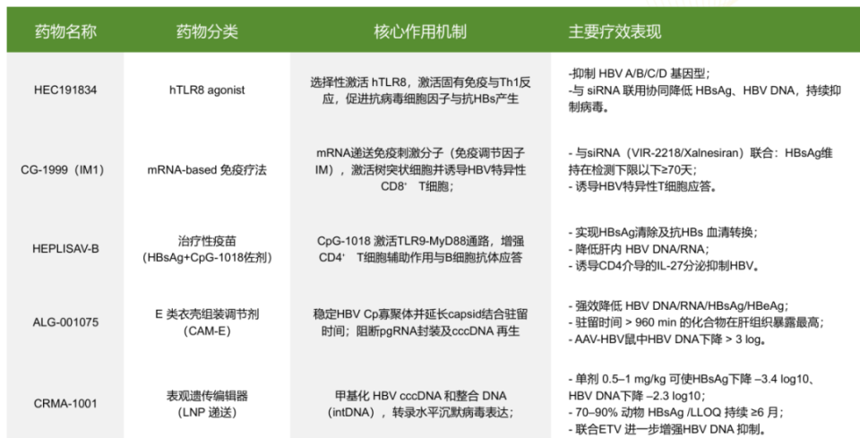 直接抗病毒药包括小干扰RNA(siRNA)、反义寡核苷酸(ASO)、核衣壳抑制剂(CpAM)、HBsAg抑制剂等;免疫调节剂则包括单克隆抗体、新型治疗性疫苗、免疫检查点抑制剂、Toll样受体激动剂等。这些药物通过不同机制协同作用,为实现乙肝功能性治愈提供了多元化的策略。