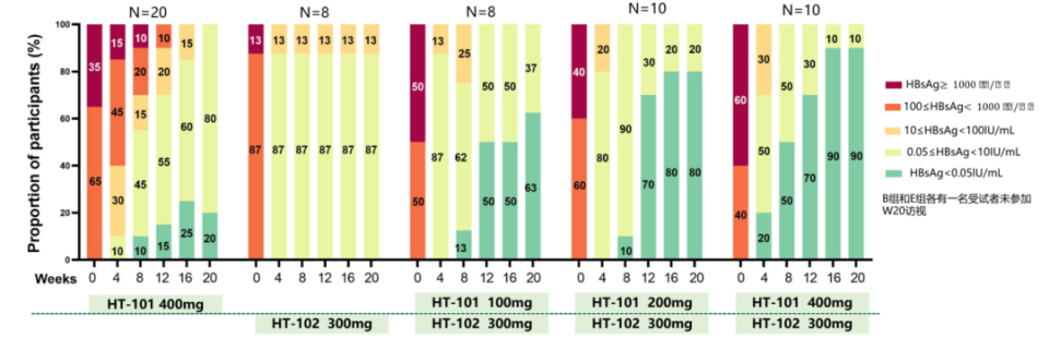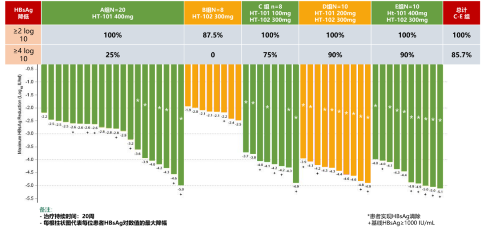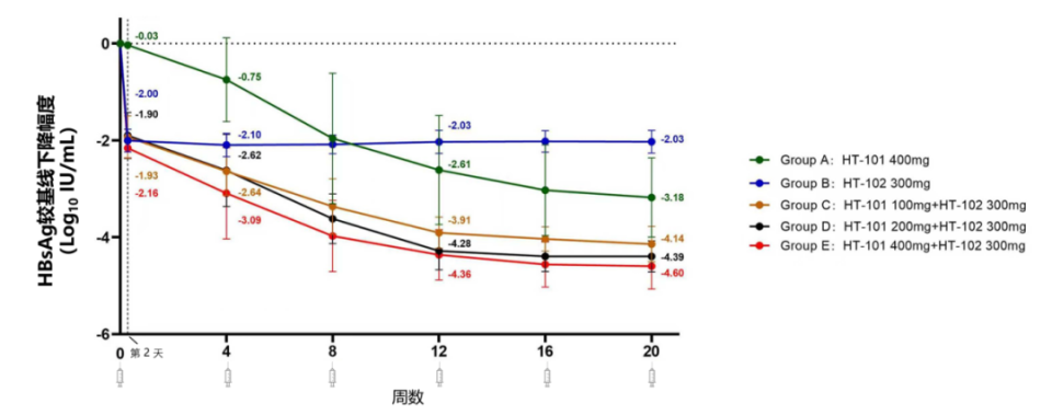 中期分析显示, HT-101单药治疗第12周时HBsAg平均降低2.6 log10 IU/mL,第20周时平均降低3.2 log10 IU/mL;HT-102单药治疗第12周时HBsAg平均降低2.0 log10 IU/mL,第20周时平均降低2.0 log10 IU/mL;联合治疗(C-E组)在第12周使HBsAg水平平均下降3.9、4.3和4.4 log10 IU/mL,在第20周时分别下降4.1、4.4和4.6 log10 IU/mL 。