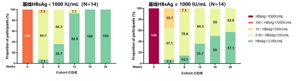 第12周时,联合治疗组中应答率为64%%,第20周时79%的患者实现HBsAg清除,其中E组有20%的患者在第4周即达到清除。